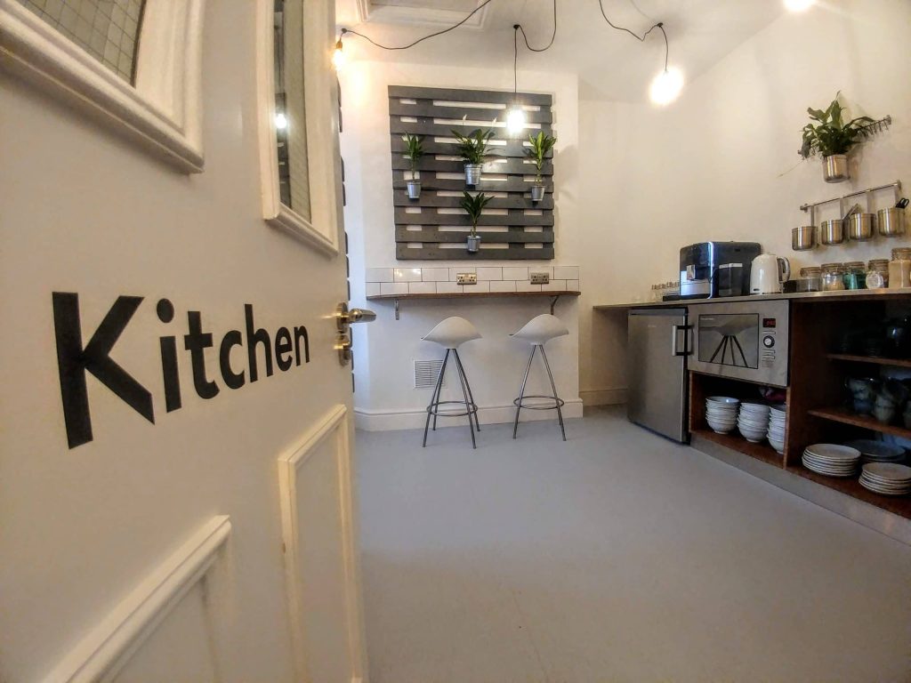 Our communal kitchen is available with unlimited locally roasted barista coffee, Clipper teas, and limited kitchen equipment.